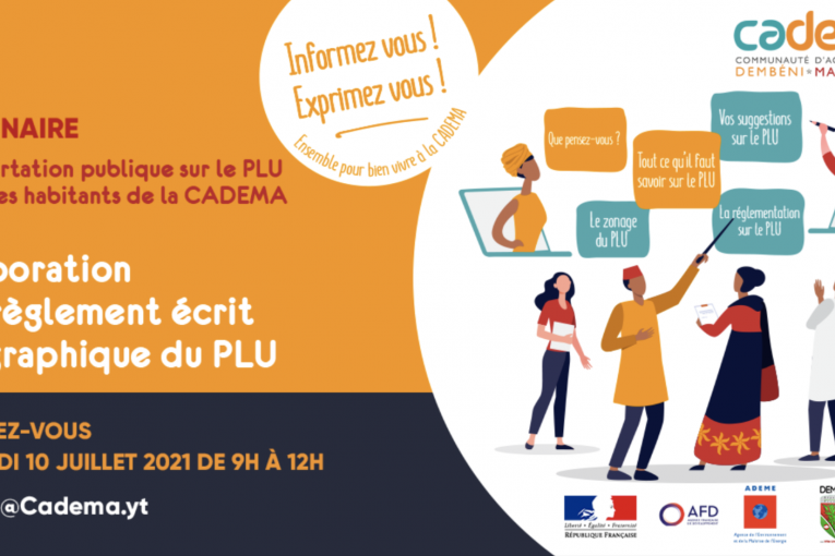 N’hésitez pas à assister au Webinaire « Élaboration du règlement écrit et graphique du PLU» organisé pour les habitants de la CADEMA, le 10 juillet de 9h00 à 12h00 en ligne ou depuis la Maison Pour Tous de Dembéni et la salle de conférence de la CADEMA dans la limite des places disponibles.