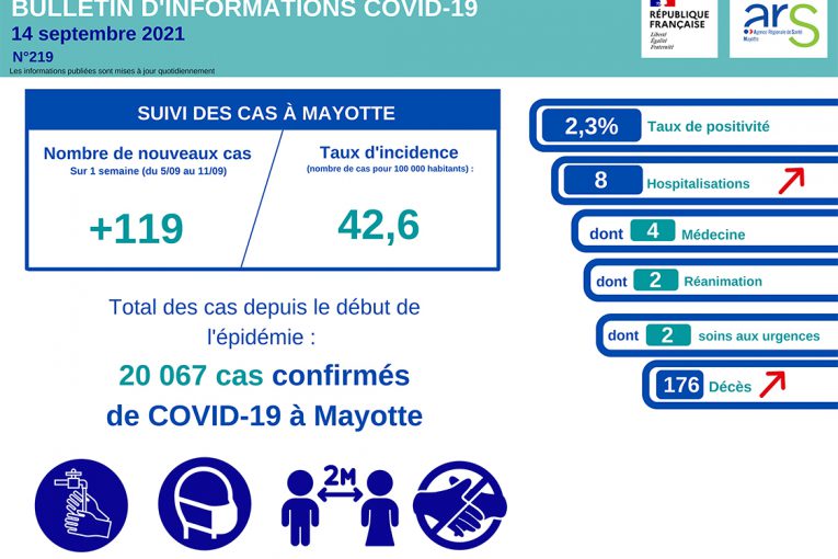 Le dernier point de situation de l’ARS sur la Covid à Mayotte démontre une nouvelle baisse avec 119 cas recensés contre 126 au dernier bilan. Le taux d’incidence fléchit aussi à 42,6 pour 100 000 habitants le taux de positivité reste légèrement au-dessus de 2 à 2,3 %.