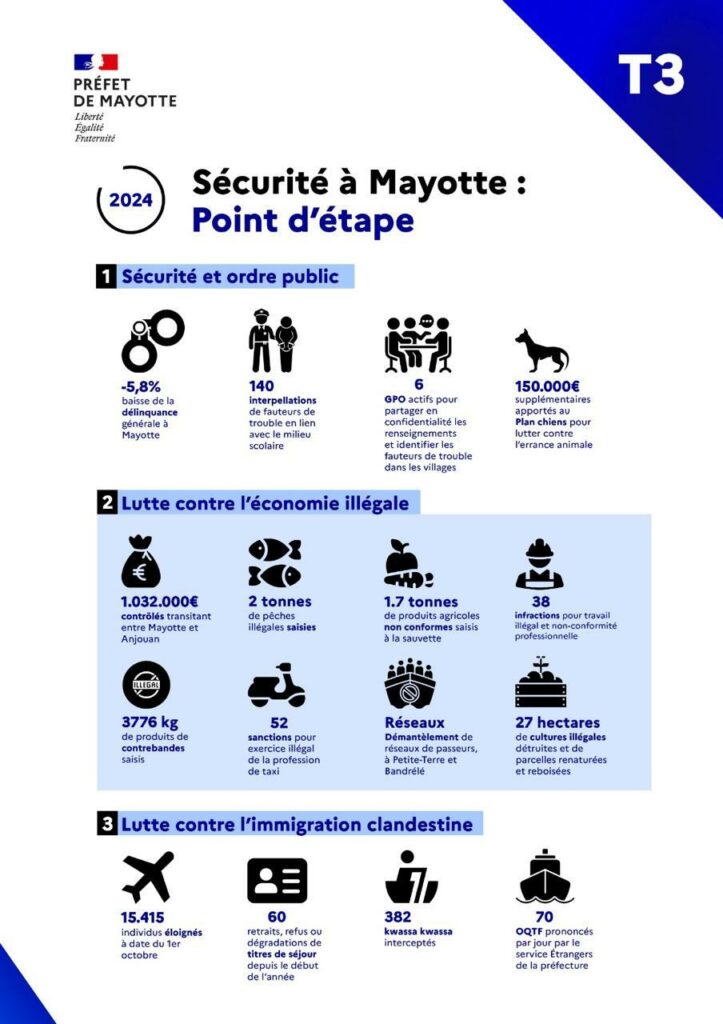 Aujourd’hui, le préfet de Mayotte a tenu sa quatrième conférence sécurité. Il a mis en avant la baisse de la délinquance générale de 5,8%, mais il est bien conscient que ça ne suffit pas, même s’il s’agit d’un résultat positif. « Il y a encore beaucoup de travail à faire », explique François-Xavier Bieuville. Les parents, dont les enfants sont à la source des troubles à l’ordre public et du sentiment d’insécurité, font partie d’un des sujets sur lequel il souhaite travailler. Il souhaite trouver des solutions avec ces parents et s’ils ne veulent pas comprendre l’intérêt de jouer leur rôle parental, les sanctions pourraient tomber. « Si jamais les parents ne partagent pas ce point de vue et qu’ils sont en détention d’un titre, je prends la responsabilité d’enlever le titre de séjour aux parents », explique le préfet. Des radars plus performants vont être installés sur le lagon pour anticiper l’arrivée de Kwassas. Concernant les points d’insécurité, l’accent sera également mis sur la lutte contre les cambriolages, les violences sexuelles et intrafamiliales.