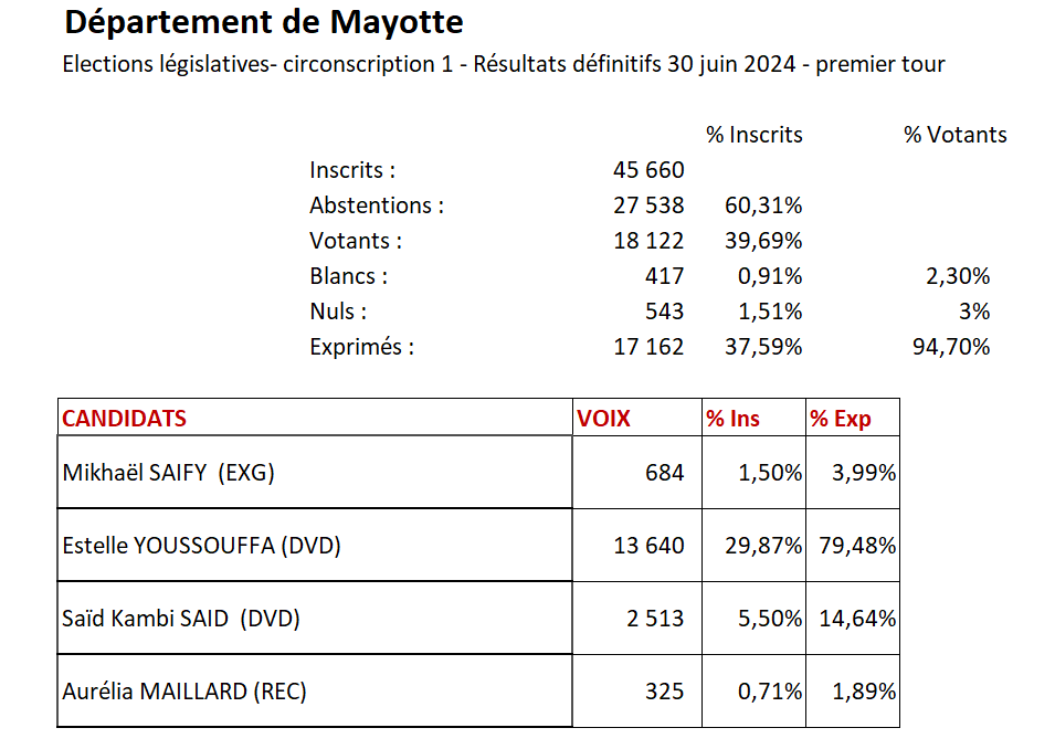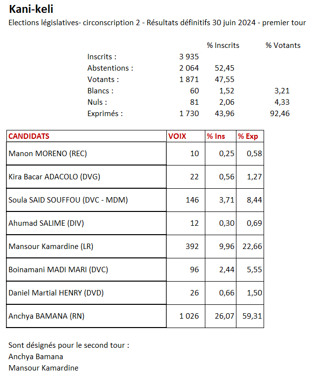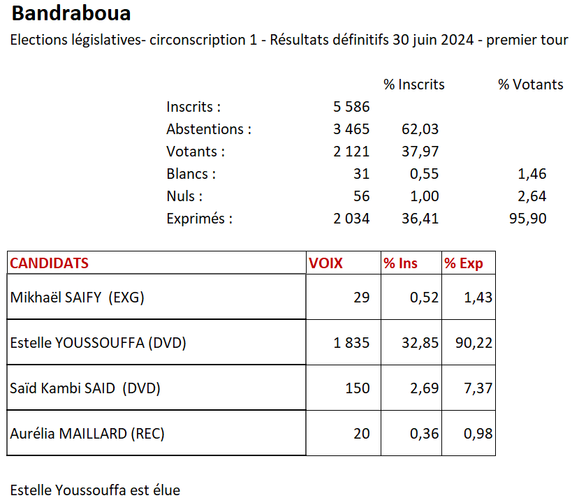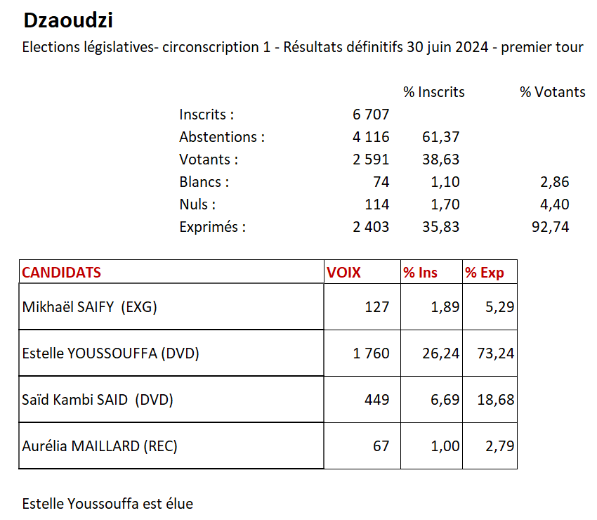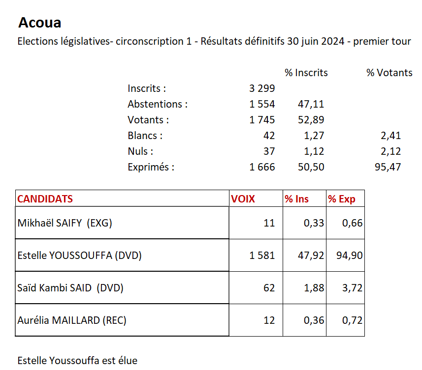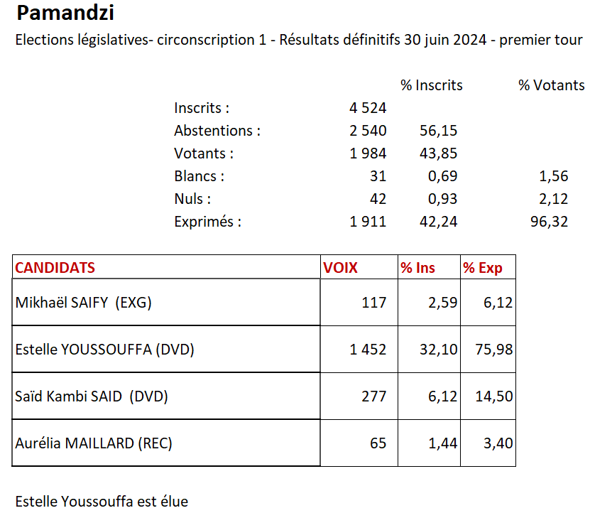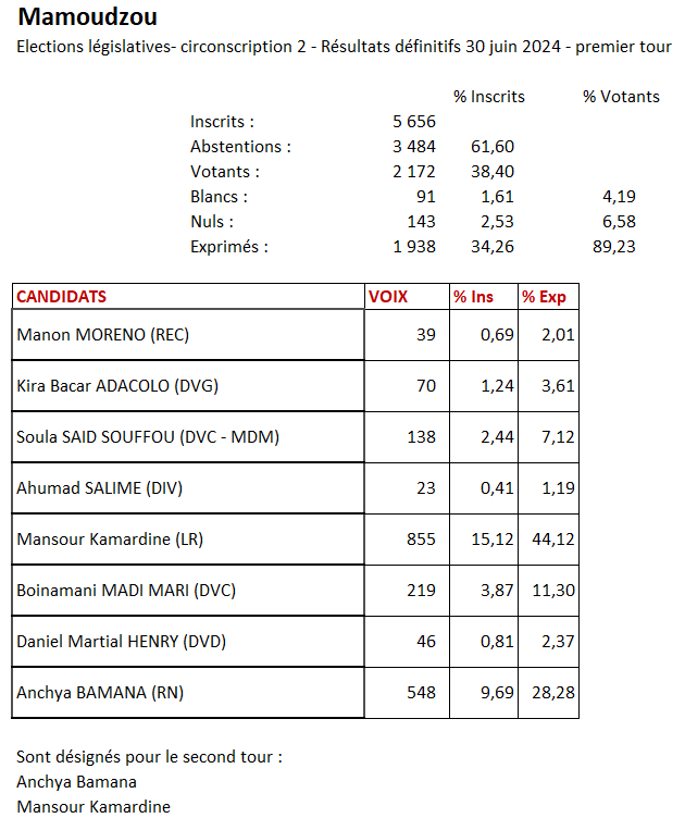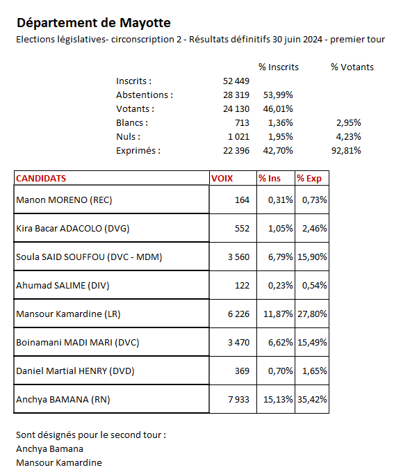 Le premier tour des législatives s’est tenu hier. Dans la première circonscription, Estelle Youssouffa a été élue, et dans la seconde circonscription, il y aura un second tour entre Anchya Bamana et Mansour Kamardine. Ci-dessous, les résultats par circonscription et par commune :