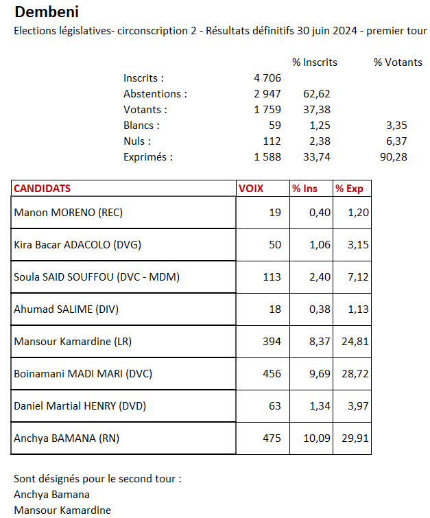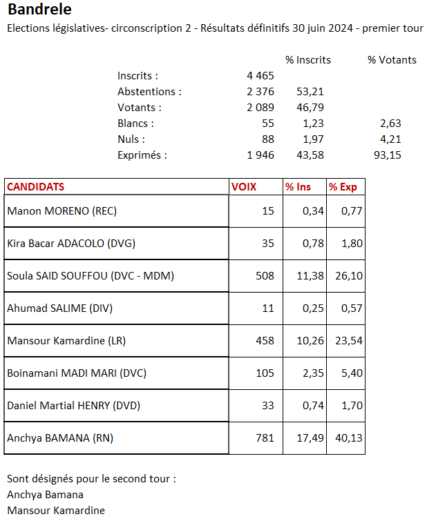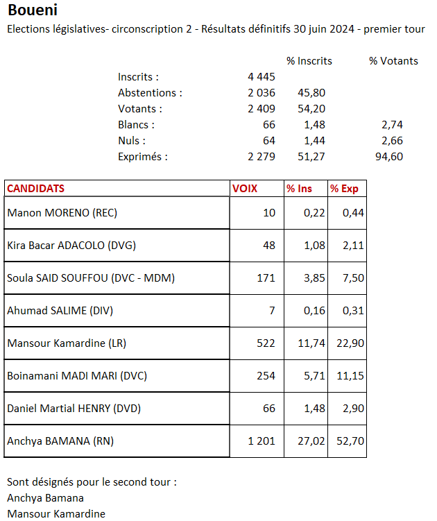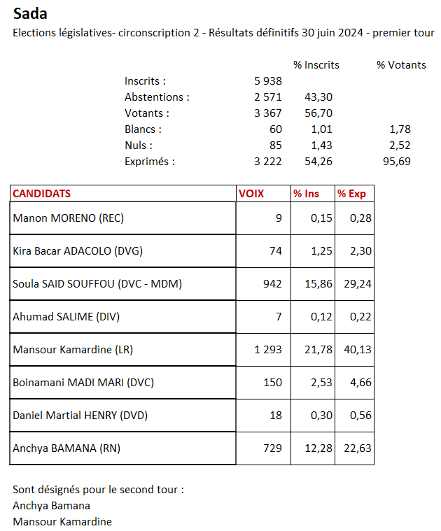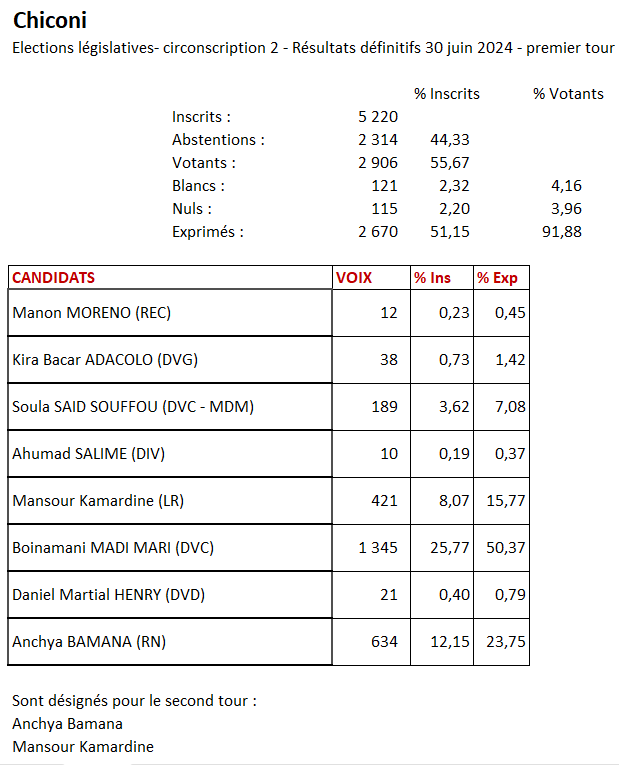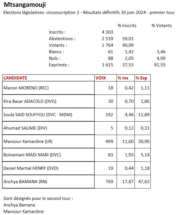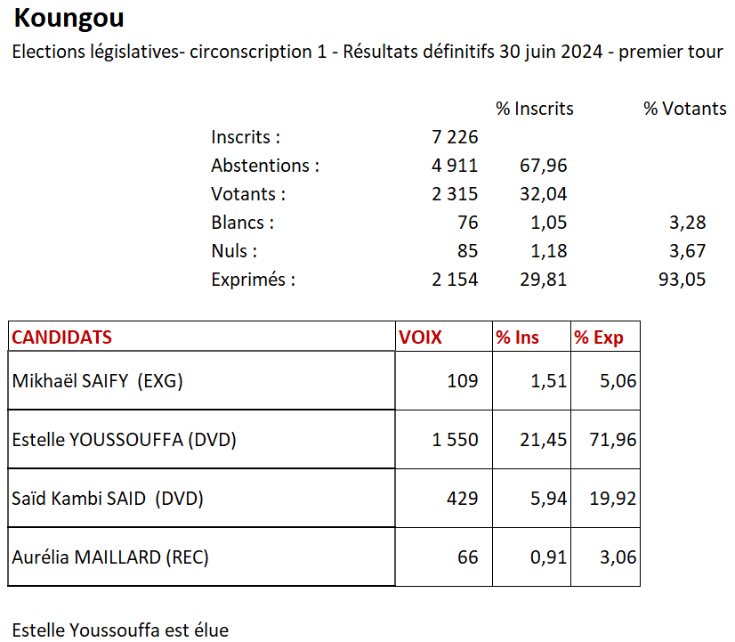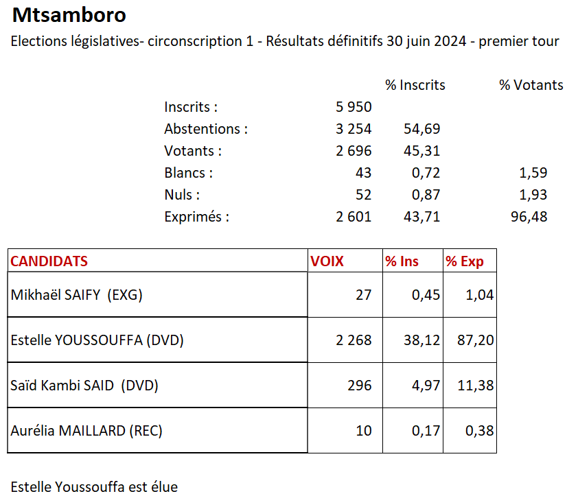 Le premier tour des législatives s’est tenu hier. Dans la première circonscription, Estelle Youssouffa a été élue, et dans la seconde circonscription, il y aura un second tour entre Anchya Bamana et Mansour Kamardine. Ci-dessous, les résultats par circonscription et par commune :