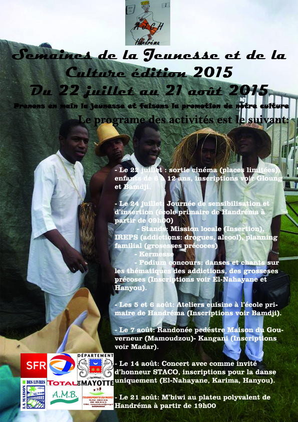 Le Président de l’Association Jeunesse et Culture de Handréma (AJCH), invite toute la jeunesse et les parents du village à prendre part à la 2ème édition des « semaines de la jeunesse et de la culture », qui se dérouleront du 22 juillet au 21 août 2015.