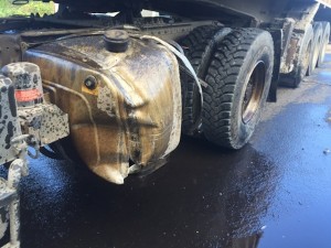 Vers 13h45, un camion de la société ETPC se dirigeant vers Mamoudzou est entré en collision avec un véhicule allant vers le sud, entre les ronds-points de Doujani 1 et Doujani 2. La route était très embouteillée et le conducteur de la voiture, ayant probablement voulu gagner quelques mètres, a entrepris un dépassement. Le camion arrivant en face a pu éviter le choc frontal mais la voiture s’est encastrée sous le poids-lourd, crevant les réservoirs. L’huile s’est répandue sur la chaussée. Le chauffeur a tout de même conservé une certaine maîtrise de son engin car, malgré les nombreux dégâts matériels, aucun blessé n’est à déplorer.