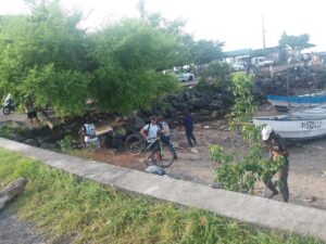 En petite-terre, les piétons passent par la plage pour rejoindre les barges