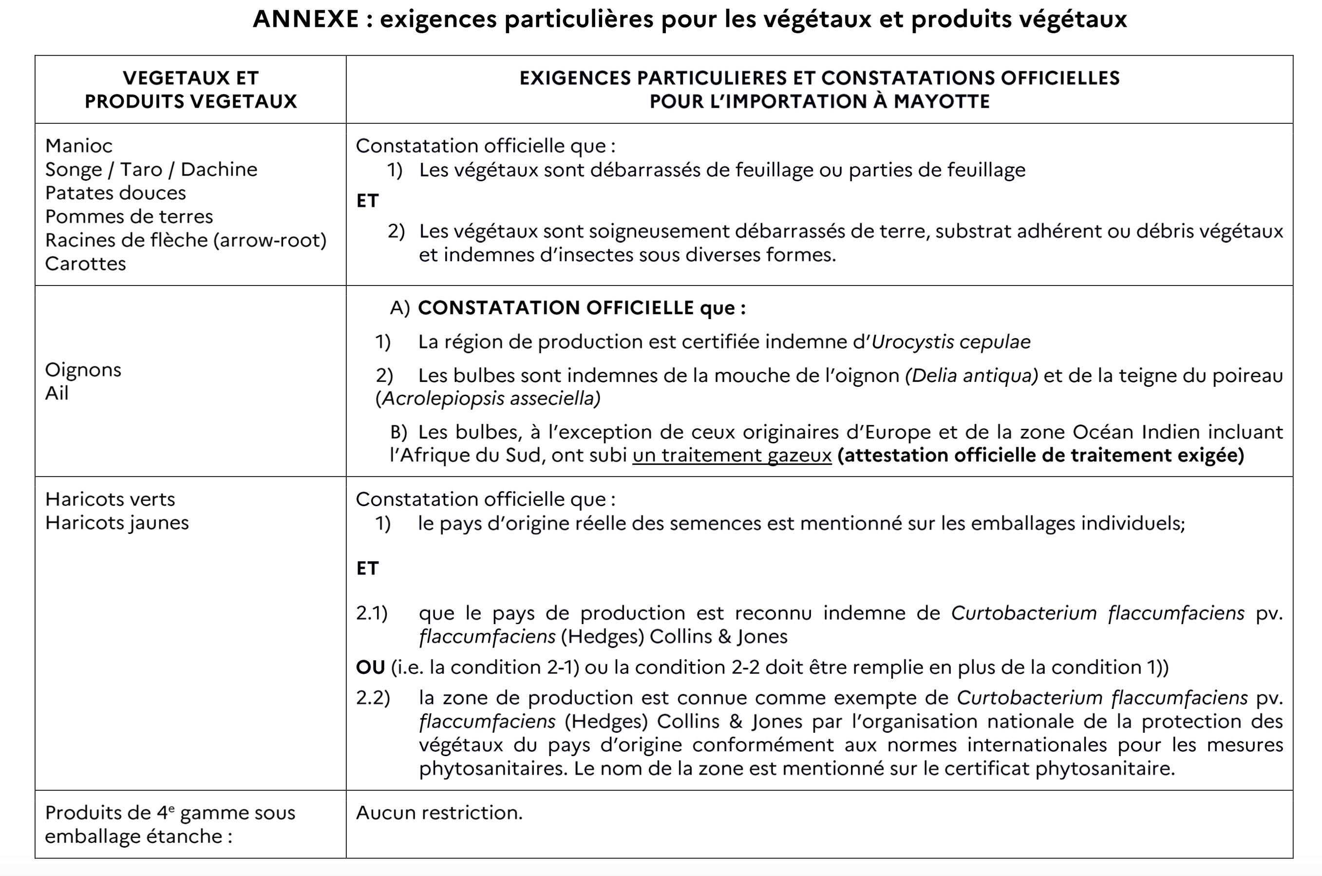 · Importation simplifiée de végétaux, en particulier de légumes, dont les conditions d’introduction du territoire sont les plus simples à justifier par le pays d’origine, notamment en ce qui concerne les légumes « racines » (Manioc, Songe / Taro / Dachine, Patates douces, Pommes de terres, Racines de flèche (arrow-root), Carottes) ; voir le tableau en annexe pour la liste complète et les exigences requises.