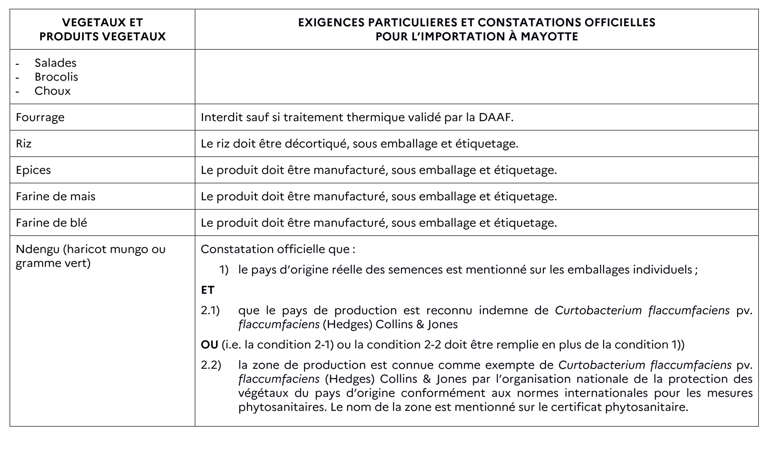 L’introduction des végétaux et produits végétaux à Mayotte est régie par l’arrêté préfectoral n°06/DAF du 10 avril 1995 qui définit les conditions et exigences sanitaires requises à l’importation. Pour des raisons de protection phytosanitaire, il est très restrictif quant à l’introduction des certains végétaux, notamment les fruits et légumes alimentaires. En effet de nombreux ravageurs et maladies existant dans d’autres territoires ne sont pas présents à Mayotte. Leur arrivée sur l’île pourrait mettre en danger la production agricole locale qui doit se reconstruire.