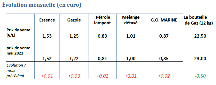 Les prix des produits pétroliers à Mayotte sont fixés en application des dispositions du code de l’énergie, notamment ses articles R. 671-23 à R. 671 37 et par un arrêté interministériel de méthode du 5 février 2014. Ainsi, les éléments d’évolution des prix des carburants et du gaz qui tiennent compte des conditions réelles du marché, sont pris en compte, notamment la parité euro/dollar et la cotation des produits à l’importation. En application de ce dispositif de régulation des prix, le préfet vient de signer l’arrêté qui fixe le tarif des produits pétroliers pour Mayotte à partir du 1er juin 2021. Les prix à Mayotte sont ainsi fixés :
