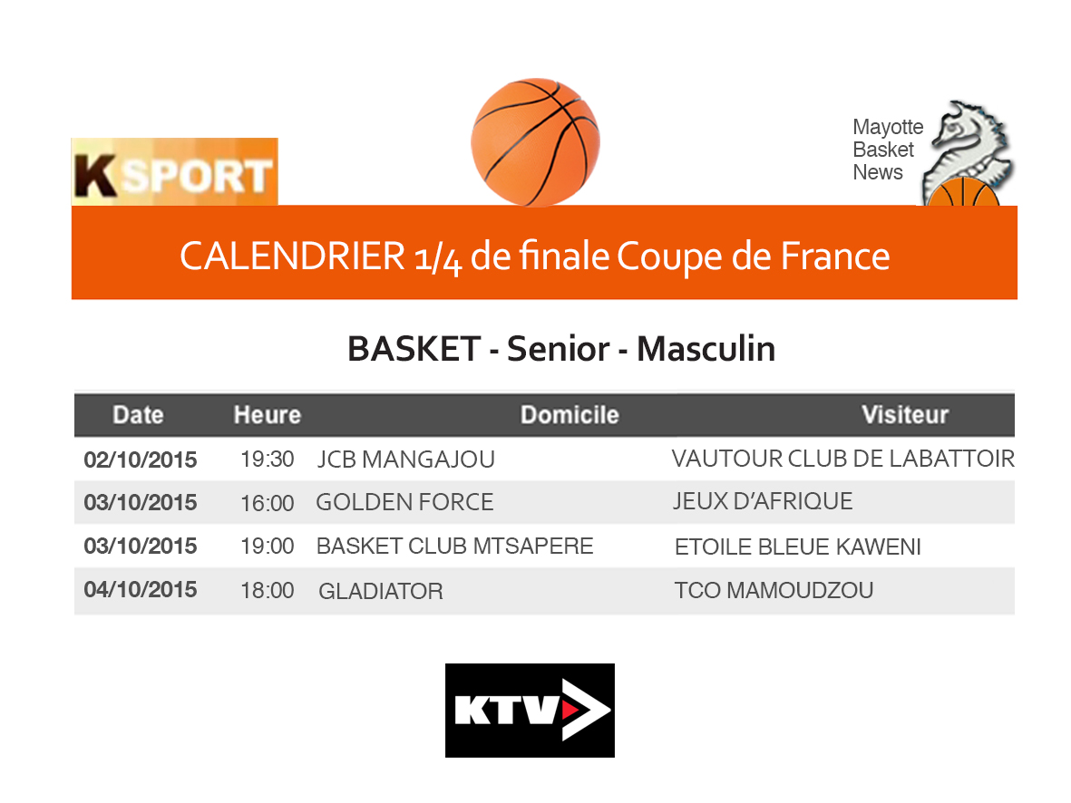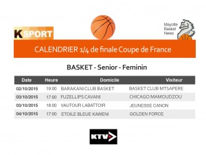 Ce week-end, le basket mahorais verra se jouer chez les femmes et chez les hommes les matchs de 1/4 de finale de la Coupe de France régionale. KSPORT se fera écho de tous les résultats lundi soir à 20h sur KTV. Ci-dessous le calendrier des matchs du week-end :