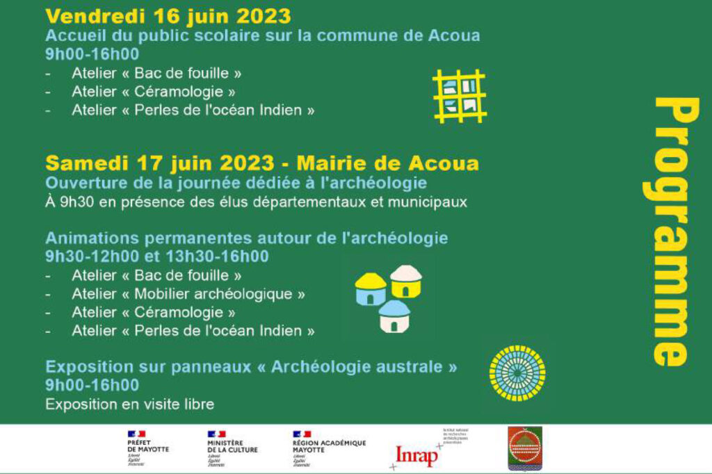Les Journées Européennes de l’Archéologie sont de retour avec le Musée de Mayotte (MuMA), pour une nouvelle édition en partenariat avec la commune de Acoua le samedi 17 juin 2023 à la mairie de Acoua.
