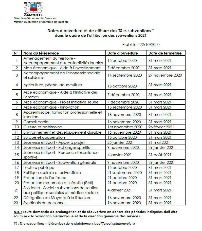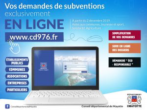 13h12 – Le Conseil Départemental de Mayotte accompagne financièrement les associations, les entreprises, les particuliers, les communes et les établissements publics. Les dossiers de demande d’aide de subvention doivent être déposés sur le site internet du département dans l’espace dédié aux demandes de subvention au lien suivant : https://bit.ly/35Ft1tM.