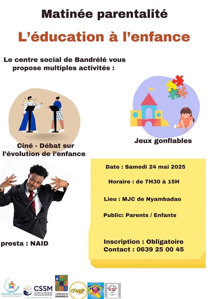 Le Centre Social de Bandrélé, en collaboration avec le CEMÉA et plusieurs partenaires, propose samedi 24 mai 2025 de 7h30 à 15, une matinée Parentalité sur le thème « L’éducation de l’enfant » à la MJC de Nyambadao.