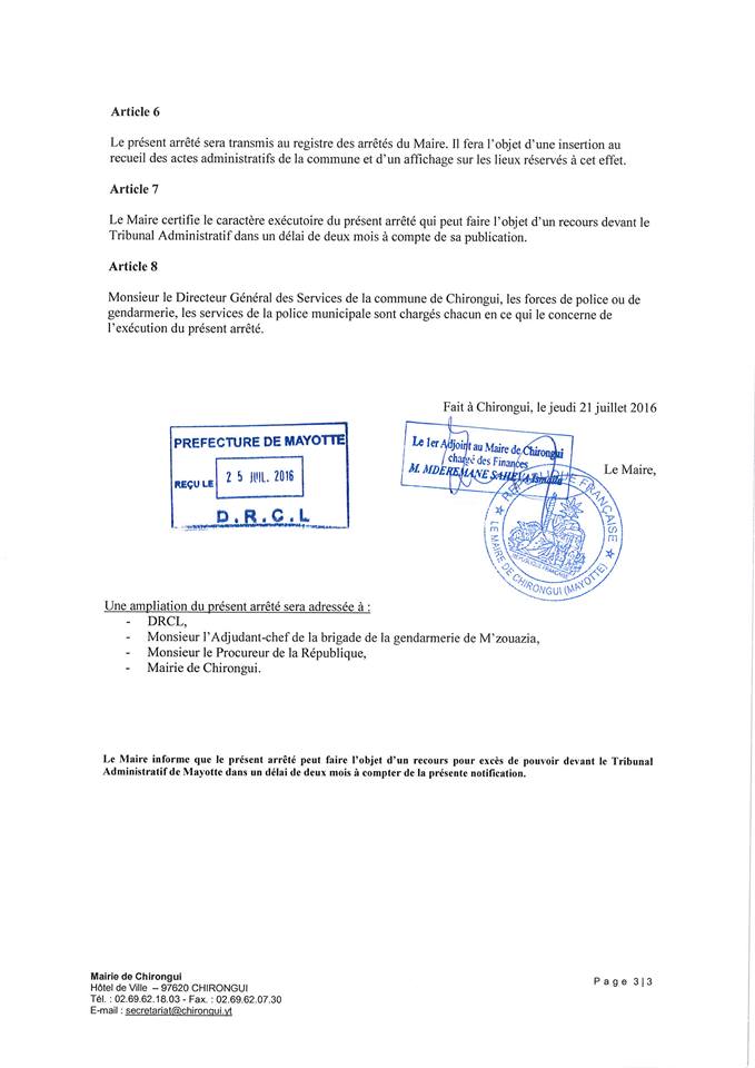 La Mairie de Chirongui informe ses administrés qu’un arrêté municipal instaurant un couvre feu pour les mineurs a été promulgué ce lundi 25 Juillet.