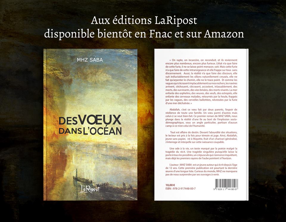 “Des voeux dans l’océan” est le premier roman d’un jeune auteur Mahorais, Mhz SABA, publié aux éditions La Ripost. Le livre sortira le 25 juillet prochain dans toutes les FNAC Métropolitaines et sur le site d’Amazon mais également par commande à la Maison des Livres à Mayotte.