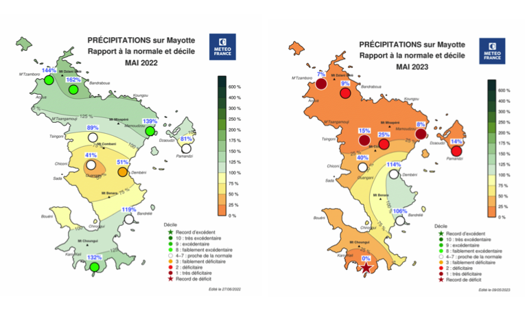 Mayotte est confronté à une sécheresse sans précédent. Le niveau de remplissage des retenues collinaires et des nappes phréatiques est exceptionnellement bas. La retenue de Dzoumogné est actuellement remplie à 29,7 % contre 98,5 % en 2022 à la même période. Celle de Combani est remplie à 47,1 %, contre 97,1 % en 2022 à la même période.