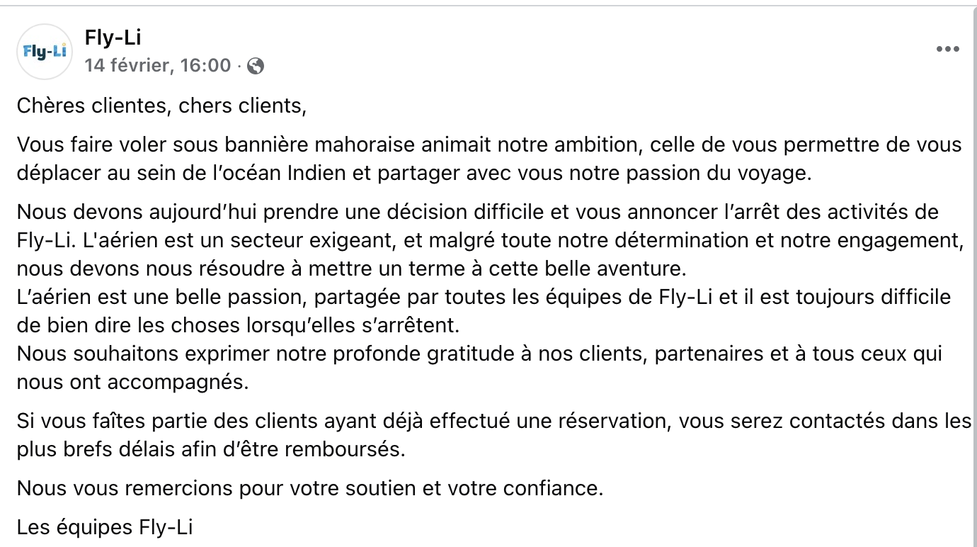 Mais vendredi après-midi, coup de théâtre : la compagnie a annoncé sur sa page Facebook qu’elle renonçait à son projet et cessait ses activités. « Nous devons aujourd’hui prendre une décision difficile et vous annoncer l’arrêt des activités de Fly-Li. L’aérien est un secteur exigeant, et malgré toute notre détermination et notre engagement, nous devons nous résoudre à mettre un terme à cette belle aventure », a-t-elle déclaré.