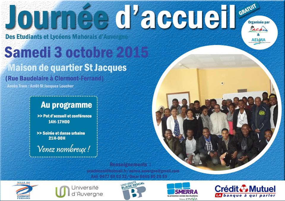 L’Association des Chiconiens d’Auvergne (ACA) et l’Association des Etudiants et Lycéens Mahorais d’Auvergne (AELMA) organisent la 3ème édition de la journée d’accueil des étudiants et lycéens mahorais de la région Auvergne le samedi 3 octobre 2015 à 14h à la Maison de quartier de St Jacques à Clermont-Ferrand. Cette année, près de 350 étudiants et lycéens sont attendus à cet événement. Une journée qui s’adresse aux nouveaux arrivants comme aux anciens étudiants déjà installés dans la région.