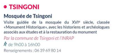 – l’histoire de la mosquée (une mosquée royale dans le sultanat de Tsingoni) à travers des visites guidées