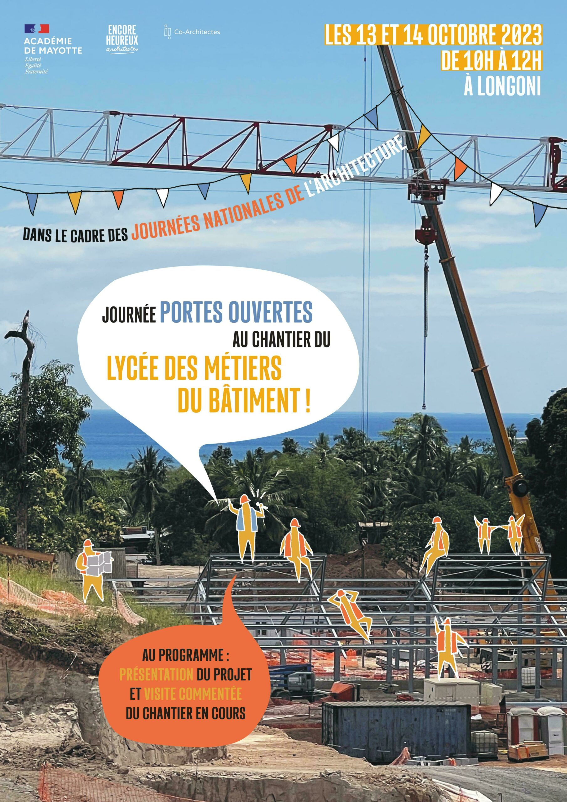 Situé sur le site de l’ancienne usine sucrière de Longoni, le chantier du Lycée des Métiers du Bâtiment vous ouvre exceptionnellement ses portes, lors d’une visite guidée commentée par la maîtrise d’œuvre, Vendredi 13 octobre 2023 de 9h30 à 11h30. Chaque créneau de visite dure environ 1 heure.