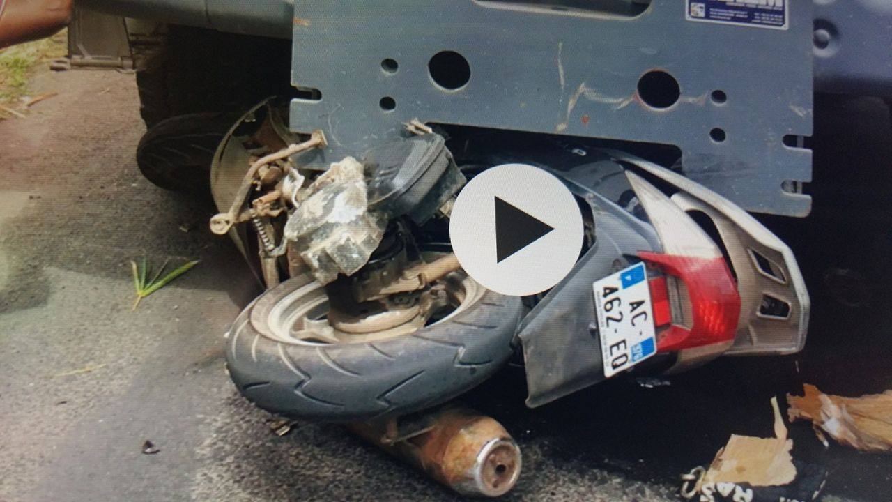 Un accident entre un scooter et un camion, comme les photos en témoignent le scooter a terminer sa course sous le camion, après que son conducteur ai fait une queue de poisson.