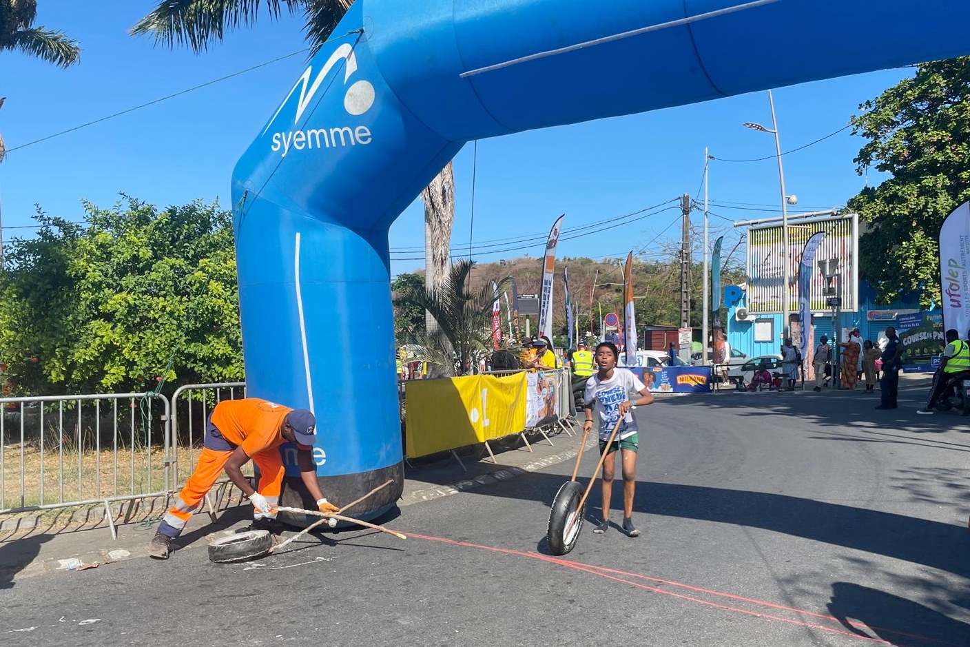La 40ème édition de la Course de pneus créée par Jack Passe a eu lieu aujourd’hui. Un parcours de 1,8 kilomètres qui a demandé beaucoup d’effort aux participants, dont certains ont été pris d’un malaise une fois la ligne d’arrivée franchie, en grande à cause d’un soleil qui a rendu la course encore plus difficile. Les participants ont été pris en charge à leur arrivée et dirigés vers des tentes à l’ombre où leur attendaient des chaises, de l’eau, à manger et des équipes médicales. Il y avait trois catégories : garçon, fille et adulte. A noter, les présences du premier vainqueur de l’épreuve en 1984, Ali Ramadani et de l’athlète Raphaël Mohamed, demi-finaliste du 110 mètres haies aux Jeux olympiques de Paris. Les 40 ans de l’épreuve se sont bien déroulés et public était présent.