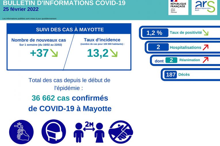 Le dernier point de situation de l’ARS quant à l’épidémie de covid à Mayotte fait état de 37 nouveaux cas au 25 févrierpour un taux d’incidence de 13,2 pour 100 000 habitants et un taux de positivité de 1,2%.