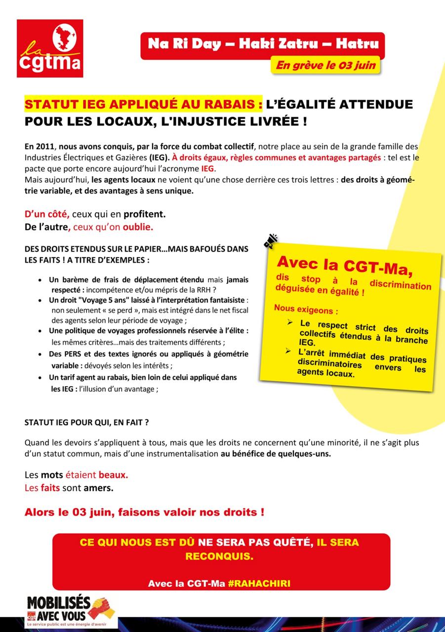 Le 3 juin, un mouvement de grève est annoncée par la CGT-Ma, seul syndicat de l’entreprise à avoir signé un préavis si les négociations avec la direction n’ont pas abouties. En cause : l’application jugée incomplète et inéquitable du statut IEG (Industries Électriques et Gazières) pour les agents locaux de Mayotte.