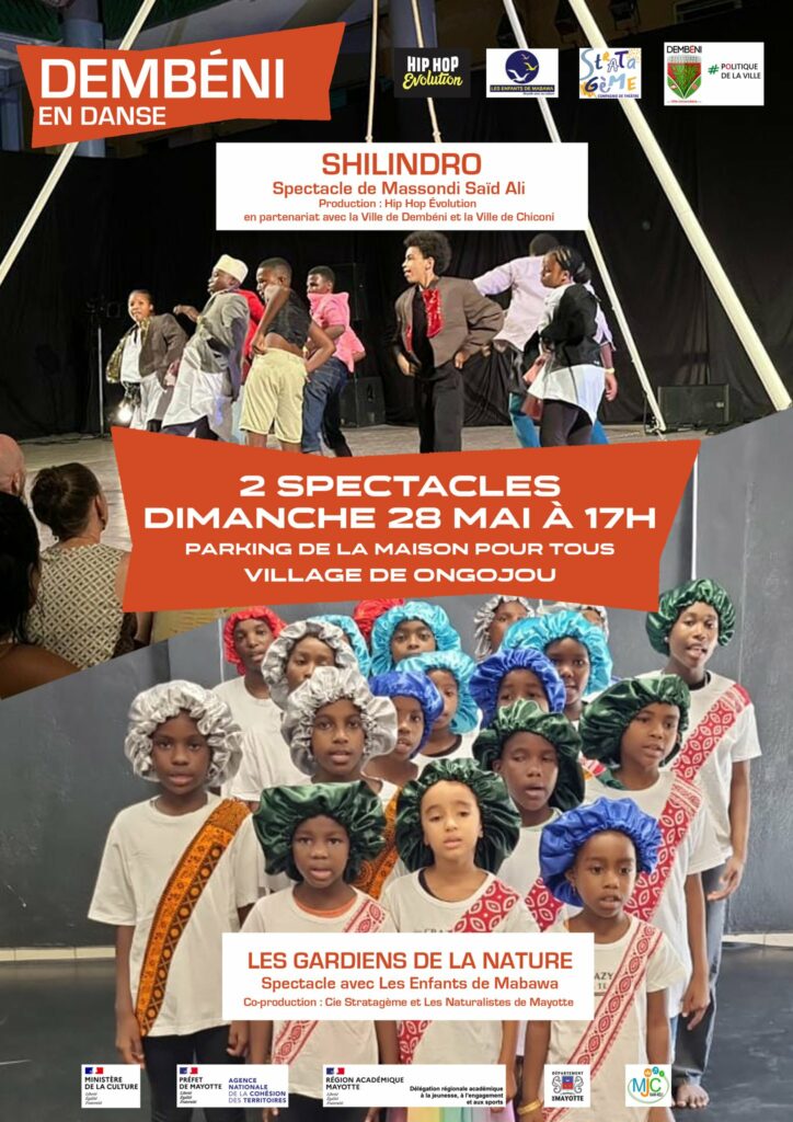 Dans le cadre de la nouvelle saison de « Dembéni en danse », venez assister, dimanche 28 mai à 17h sur le parking de la Maison Pour Tous de Ongojou, aux spectacles :