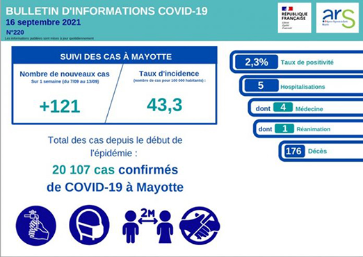 Le dernier point de situation de l’ARS quant à la Covid à Mayotte fait état au 16 septembre de &21 nouveaux cas pour un taux d’incidence qui remonte très légèrement à 43,3 pour 100 000 habitants. Le taux de positivité est pour sa part établi à 2,3% et il n’y a plus que 5 hospitalisations (4 en médecine et 1 en réanimation).
