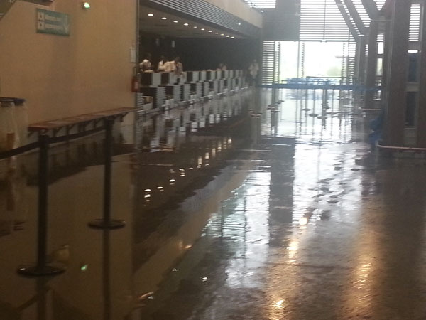 Nouvelles inondations en fin de matinée à l’aérogare de Pamandzi où après un nouvel épisode pluvieux venant du Nord avec des vents violents, l’eau s’est engouffrée par la pente de toit ouvert au niveau des guichets d’enregistrement. Nouvelle douche pour les candidats au voyage et ce, malgré les bâches qui avaient été installées pour limiter les dégâts.