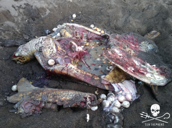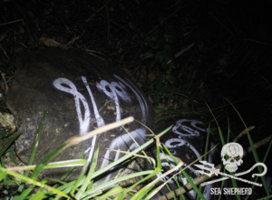 Il a été très frustrant pour nos équipes d’assister au comportement inadmissible de certains gardiens qui, pressés de rentrer chez eux, poussent du pieds des mamans tortues n’ayant pas encore pondu, pour les contraindre à quitter la plage. Hier matin, notre équipe a retrouvé une tortue braconnée sur la plage de Moya 1, au nez et à la barbe des gardiens, juste en contrebas de leur cabane. Une fois de plus, ils étaient restés toute la nuit dans leur cabane.