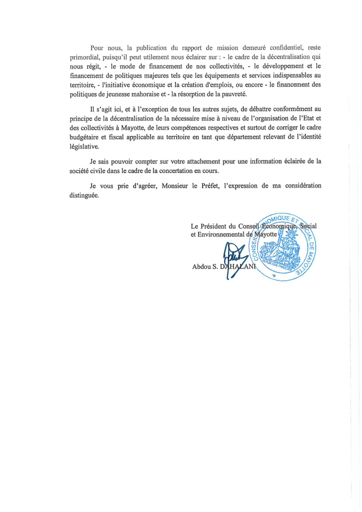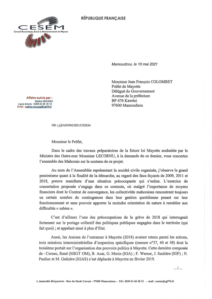 Dans une lettre à retrouver ci-dessous, Abdou Dahalani, président du Cese Mayotte, veut que la préfecture communique sur les résultats concrets de la concertation sur le projet de loi Mayotte.