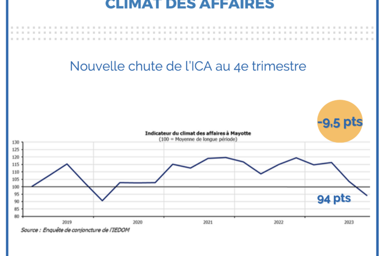 L’Institut d’émission des départements d’Outre-mer (IEDOM) de Mayotte a publié les tendances conjoncturelles sur la situation économique au quatrième trimestre 2023, soulignant une détérioration significative du climat des affaires. Les multiples crises, notamment la crise de l’eau et le contexte sécuritaire préoccupant, ont exacerbé les inquiétudes des acteurs économiques.