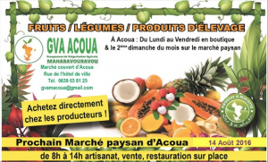 Le Président du Groupement de Vulgarisation Agricole d’Acoua (GVA d’Acoua), BARAKA Salami, informe que le prochain marché paysan d’Acoua aura lieu le dimanche 14 Août 2016.