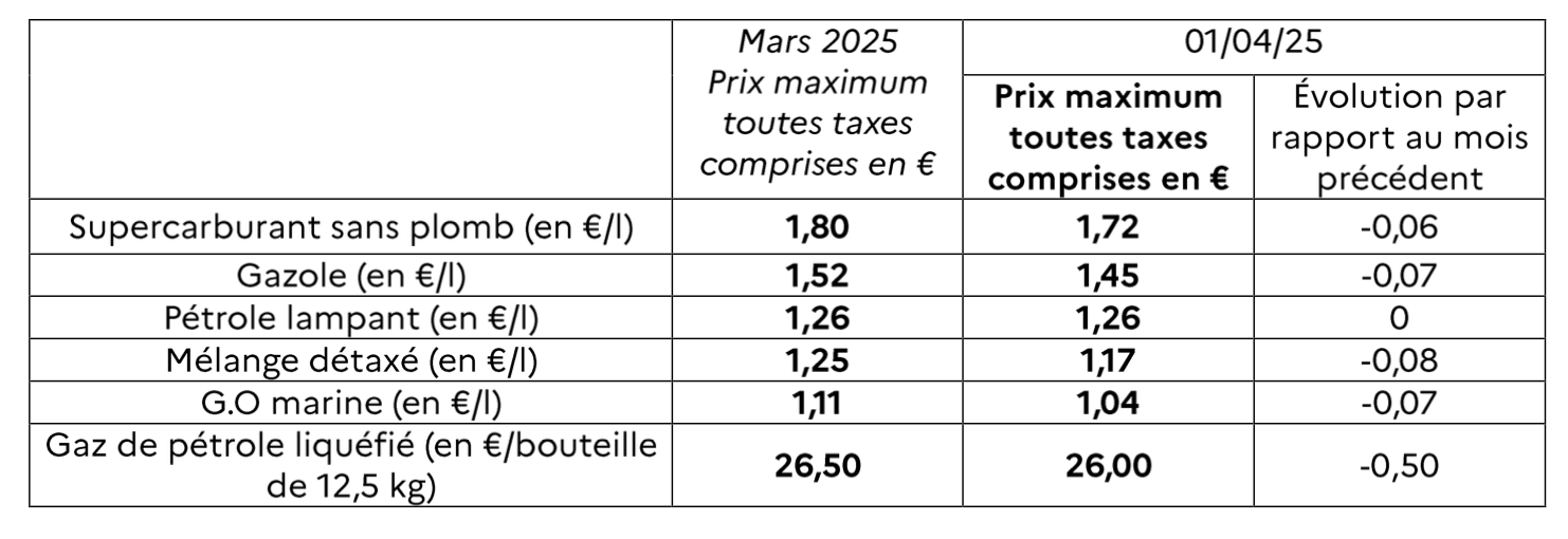 Ainsi, au 1er avril 2025, les prix maximums applicables à Mayotte seront les suivants :
