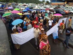 Ce matin, les bouénis du marché ont manifesté spontanément autour du rond point de la barge et devant la CCI.
