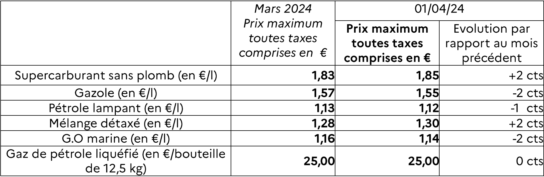 Au 1er avril 2024, les prix maximums applicables à Mayotte seront les suivants :
