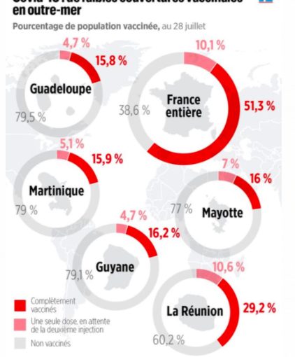 A La Réunion, c’est un peu mieux ; 29,2 % de vaccinés pour 10,6 % ayant eu une première dose.