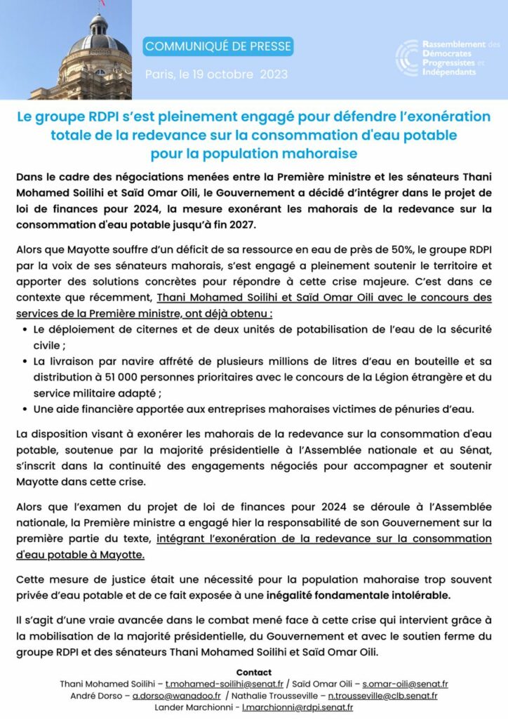 Dans le cadre des négociations menées entre la Première ministre et les sénateurs Thani Mohamed Soilihi et Saïd Omar Oili, le Gouvernement a décidé d’intégrer dans le projet de loi de finances pour 2024, la mesure exonérant les mahorais de la redevance sur la consommation d’eau potable jusqu’à fin 2027.