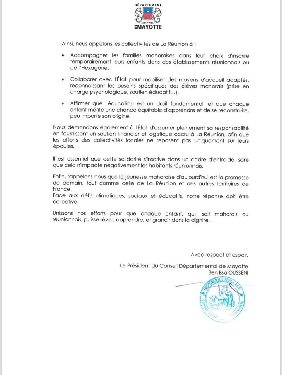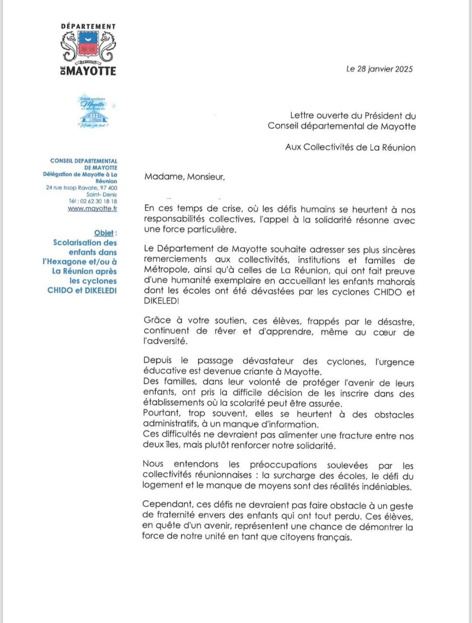 Lettre ouverte du Président du Conseil départemental de Mayotte aux collectivités de La Réunion