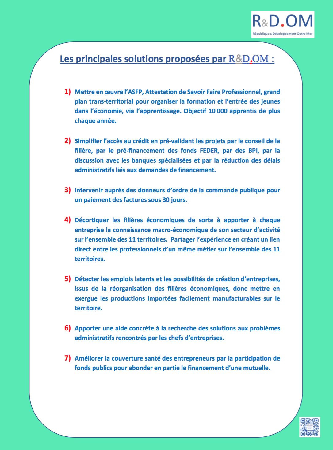 L’association R&D.OM a été crée tout récemment afin de rechercher toutes les solutions permettant de réduire le chômage dans les territoires d’outre-mer. Elle souhaite notamment mettre en oeuvre des solutions pragmatiques et rapides pour permettre le développement des très petites entreprises. R&DOM se veut en outre, une association de mise en réseau économique des 11 territoires français d’Outre-Mer