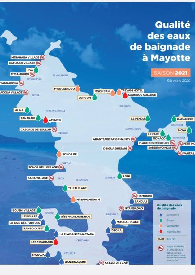 C’est en tout cas ce que disent les dernières études de l’Agence Régionale de Santé de Mayotte. Pour rappel, voici la carte de la qualité des eaux de baignade à Mayotte, éditée par l’ARS :