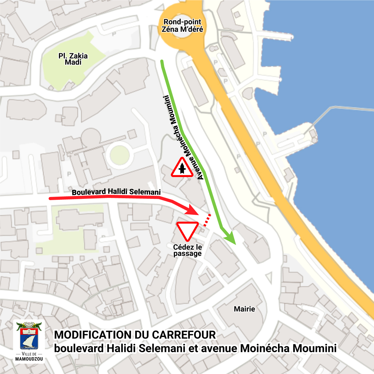 A compter du vendredi 12 juillet 2024, demain donc, un panneau “Cédez le passage” entrera en vigueur à l’intersection du boulevard Halidi Selemani et de l’avenue Moinécha Moumini. Les véhicules qui circulent sur le boulevard Halidi Selemani devront donc céder le passage à ceux venant de l’avenue Moinécha Moumini. La ville de Mamoudzou précise que l’installation de ce panneau “Cédez le passage” a pour objectif de sécuriser la circulation au niveau du carrefour.