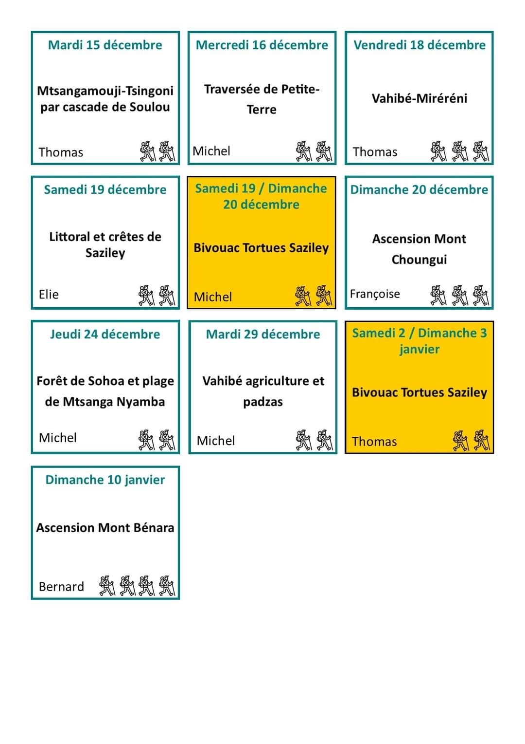 Et son programme est pour le moins chargé. Ascensions des monts Choungui et Bénara, bivouacs avec des tortues, randonnées ou PMT, il y en a pour tous les goûts. Un planning des activités à retrouver ci-dessous.