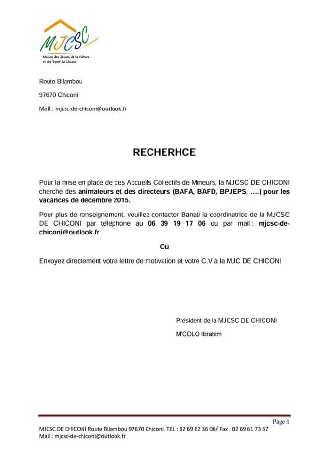 Envoyez directement votre candidature (CV et Lm) à la Mjc de Chiconi à l’adresse suivante : route Bilambou, 97670 Chiconi.