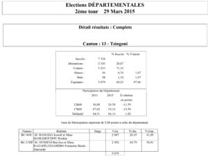 Résultats Départementales 2015 : Tsingoni remporté par Ben Issa OUSSENI et Fatimatie RAZAFINATOANDRO
