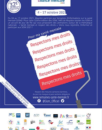 Du 04 au 17 octobre 2021, Mayotte participe aux Semaines d’informations sur la santé mentale (SISM) ! Pour cette 32ème édition des SISM, l’ARS de Mayotte soutient les GEM et un accueil de jour de l’île propose des animations autour de la thématique nationale : « Santé mentale et respect des droits ».