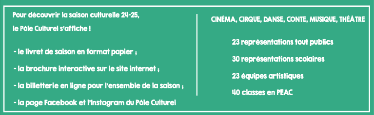 Durant cette journée vous pourrez découvrir le livret de saison, les spectacles (théâtre, cirque, conte, musique, marionnette, danse), les projets d’éducation artistique et culturel (PEAC), ainsi que les nouvelles collaborations proposées tout au long de cette nouvelle saison 2024-2025.