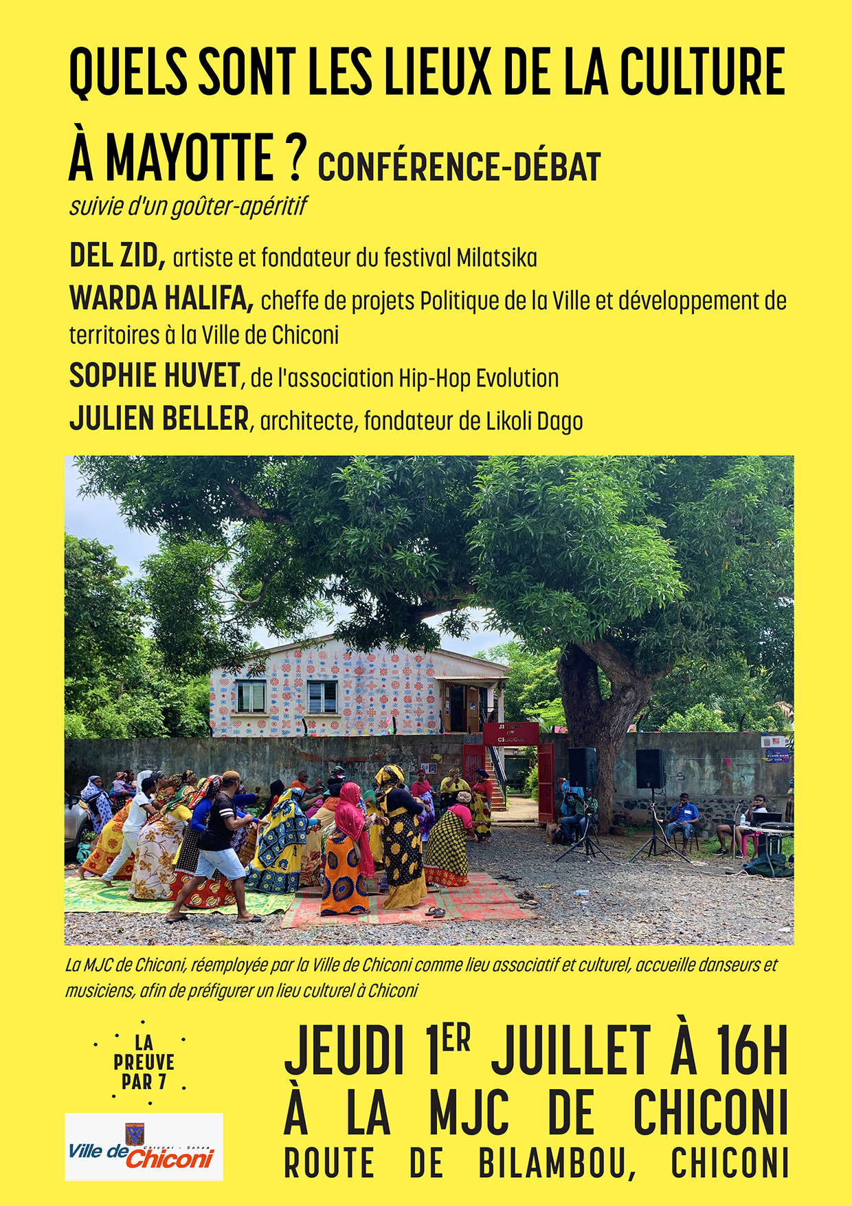 A l’occasion de la venue de l’équipe de la Preuve par 7 à Chiconi, un débat convivial à la MJC de Chiconi est organisé demain, le 1er juillet à partir de 16H, entre Del Zid, musicien, fondateur du festival Milatsika Emergence et porteur du projet de pôle culturel, Warda Halifa, Cheffe de projets Politique de la Ville et développement de territoires à la Ville de Chiconi, Sophie Huvet, directrice de Hip Hop évolution, association porteuse du projet de Centre de Développement Artistique et Educatif de Mayotte au lieu-dit Paradis des makis et Julien Beller, architecte et co-fondateur de Likoli Dago, ainsi que d’autres porteurs de projets culturels et urbains à Mayotte, animé par l’équipe de la Preuve par 7, et suivi d’un petit goûter-apéritif aux alentours de 17h,17h30.