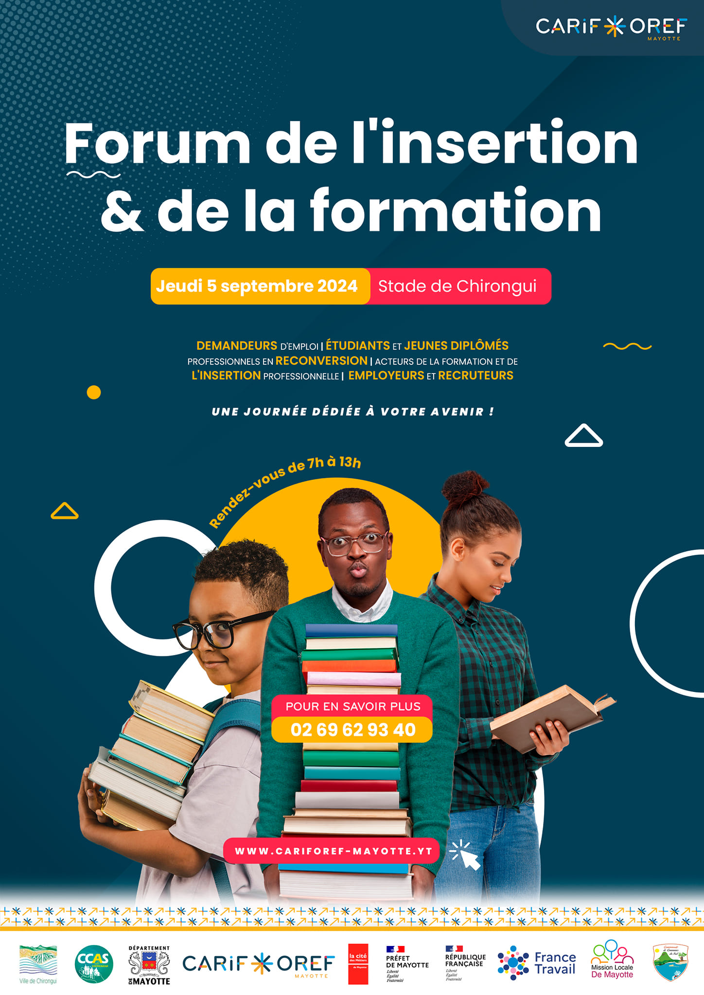 Afin de bien débuté l’année scolaire 2024-2025, le GIP CARIF-OREF et la Cité des Métiers Mayotte, en étroit partenariat avec la commune de Chirongui, la Communauté d’Agglomération du Sud et en appui avec les acteurs écomoniques (AOF, opérateurs économiques etc…..) organisent un Forum de l’Insertion et de la Formation Professionnelle afin de sensibiliser les collégiens, les lycéens, les étudiants, les demandeurs d’emploi mais aussi les salariés sur les dispositifs existants d’insertion et de formation sur le département.