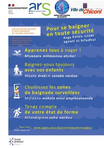 Néanmoins, à l’occasion de la journée mondiale de lutte contre les noyades (résolution O.N.U), lune première plage à Chiconi a été dotée d’une signalétique de sécurité…traduite en Kiboshi (shimaore en cours…).